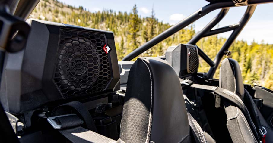 - Sistema de áudio Rockford Fosgate Stage 4, ajustado de fábrica e integrado, com unidade de origem RIDE COMMAND. Inclui: (2) tweeters de 100 W de 1"", (2) colunas dianteiras de 6,5"" de 100 W (componentes), (2) colunas traseiras coaxiais de 6,5"" de 100 W, (1) amplificador de 4 canais de 400 W e (1) subwoofer de 10" com amplificador integrado de 400 W. Sistema de áudio testado para imersão em água (IPX7 e IPX9K), garantindo resistência a ambientes húmidos e à exposição à água.