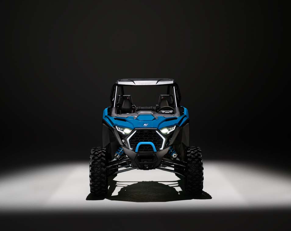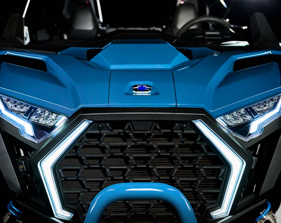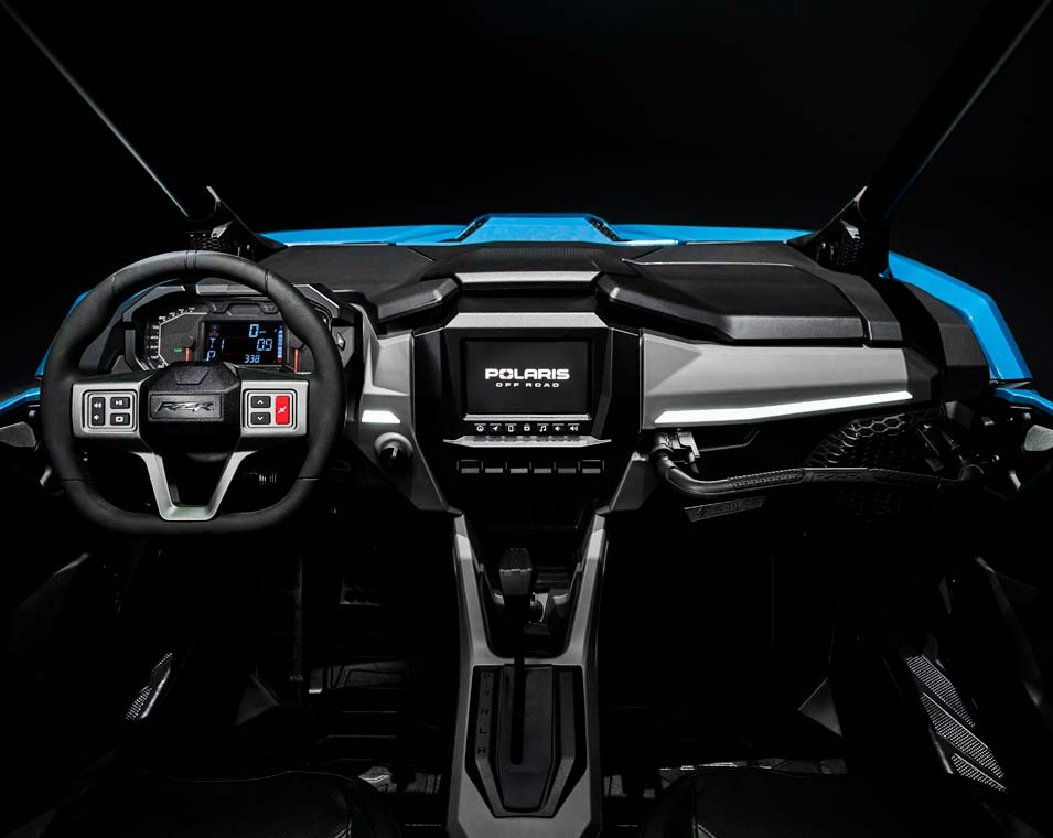 - Iluminação de destaque animada “RZR Fang” exclusiva; luzes LED de médios/máximos brancas e luzes LED traseiras/travão vermelhas; iluminação de destaque interior animada.