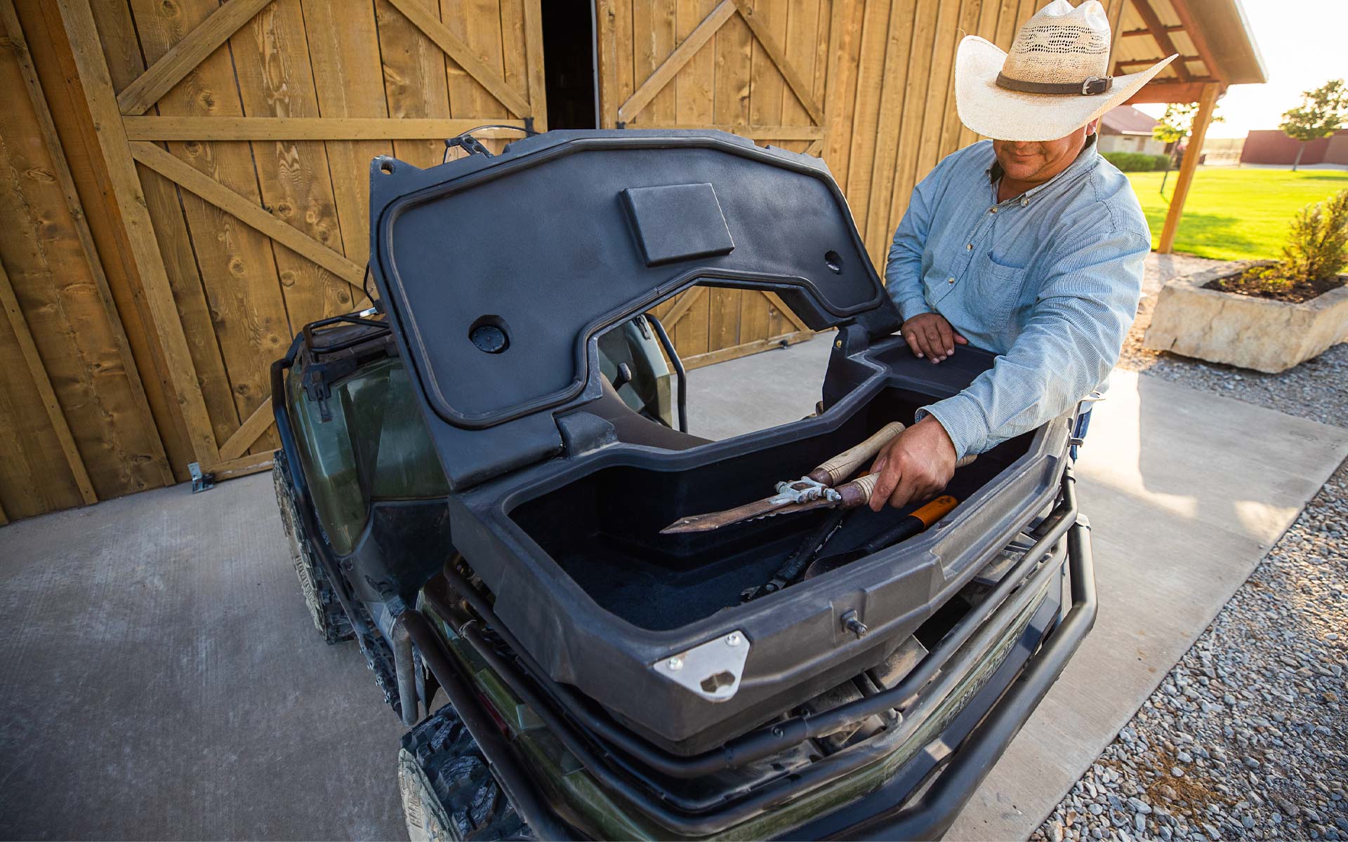 Tomada de 12 V, porta de carregamento lento no painel, sistema de segurança ativado por PIN (P.A.S.S.). Guincho de 3500 lb com cabo de aço. Extensor de rack dianteiro e traseiro, suporte para guincho incluído.