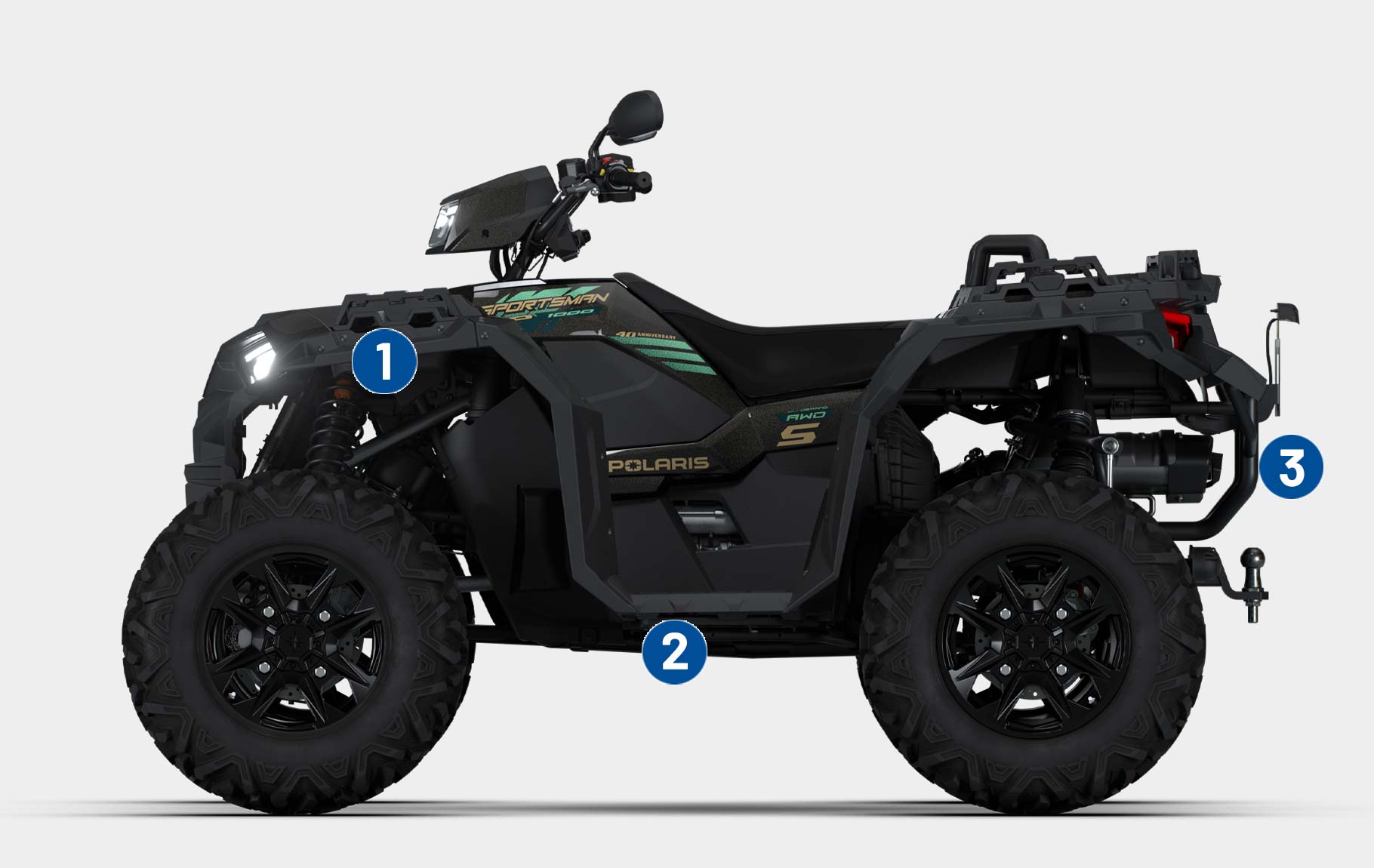 - 12-volt power plug, in-pod trickle charging port, PIN-activated security system (P.A.S.S.). 3,500 Lb. Winch with Synthetic Rope. Rear bumper, painted plastics, fender flares, 6 moveable tie-down points.